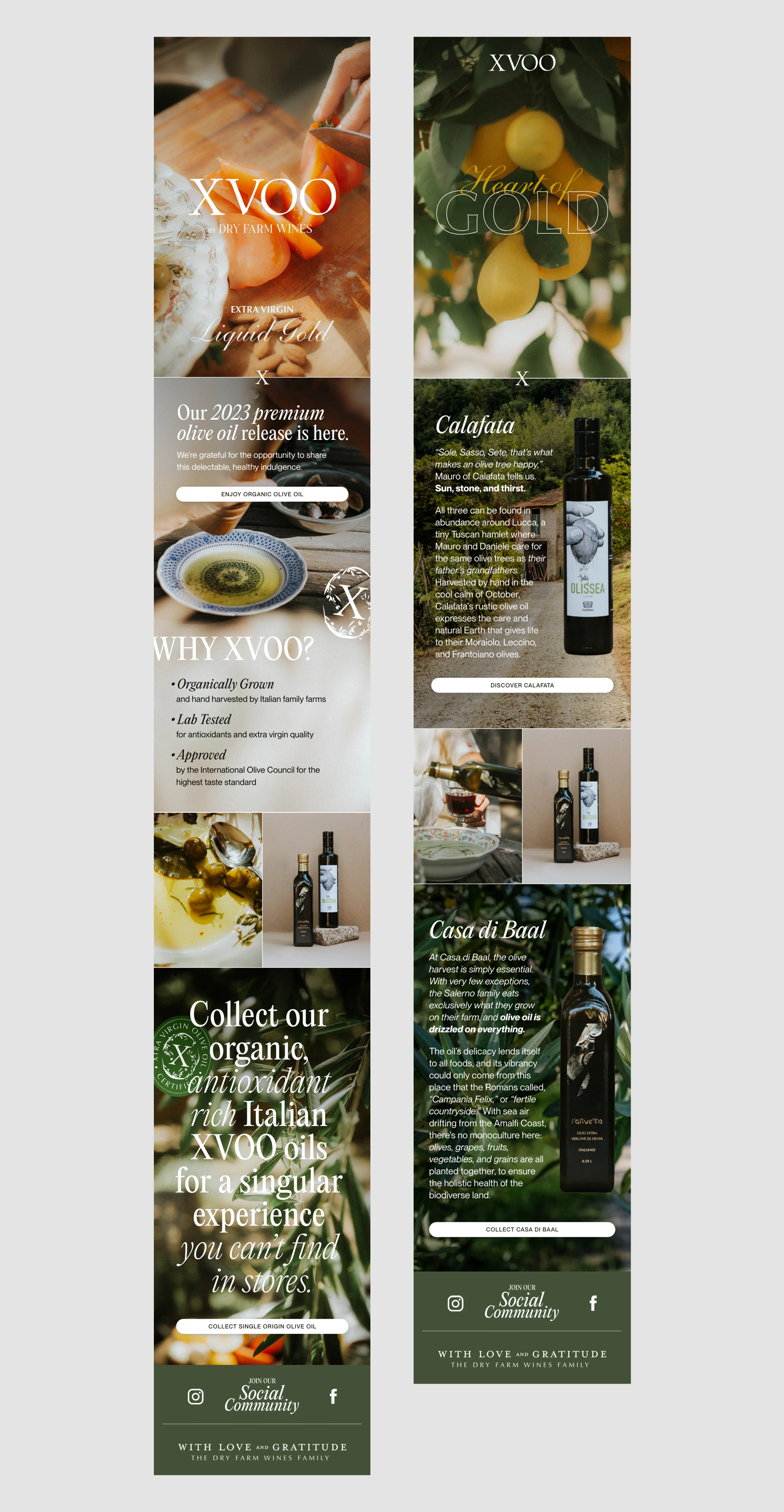 XVOO set out to enter a saturated olive oil market with a differentiator that mattered: verified purity. I led the creative direction across brand identity, packaging, website, photography, and email, building a system centered on lab-tested authenticity and the freshness of small-batch Italian oils. Because XVOO sources from multiple independent makers, each with their own labels, the brand needed a unifying visual language that could elevate their stories while creating consistency online. The result is a cohesive, premium identity that brings artisan producers to the U.S. market with clarity and credibility they otherwise wouldn’t have the resources to achieve.